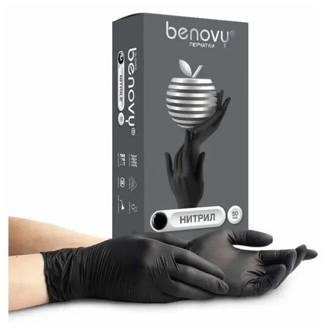 Перчатки нитриловые BENOVY 50 пар S чёрные оригинальные